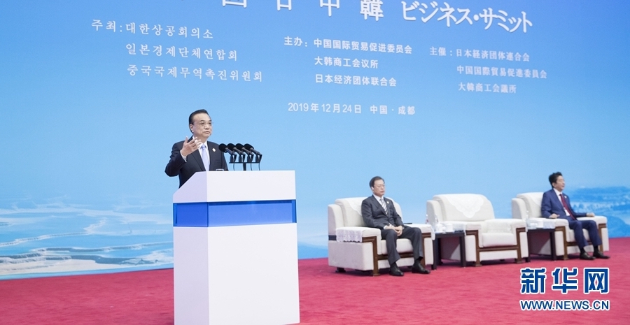 Premier Li Keqiang addressed the 7th China-Japan-Republic of Korea (ROK) Business Summit in Chengdu, Southwest China's Sichuan province, with ROK President Moon Jae-in and Japanese Prime Minister Shinzo Abe, on Dec 24.2019. (Xinhua)